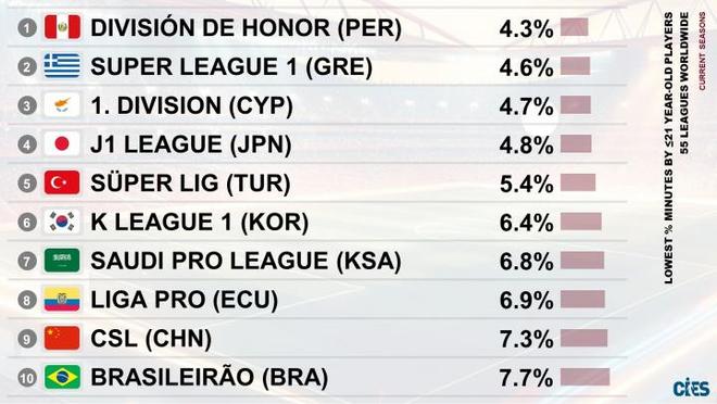 近日,瑞士足球统计组织知名权威机构CIES(国际体育研究中心)发布了全球55个顶级联赛的最新统计报告,衡量了不同联赛年轻球员的训练强度以及U21球员的出场时间比例。这份榜单的排名方式是从Low到High,也就是说排名越高,U21球员代表联赛出场的时间就越少,这也意味着联赛并没有给年轻人机会。榜单数据显示,中超联赛位居本次榜单榜首,揭示了中国足球青训转型的深层次危机。据Cies统计,中超联赛以U21出场时间的7.3%在全球55个顶级联赛中排名第9。在这方面,U21球员的出场次数在55个大联盟中排名第9。中超联赛中,U21球员合计出场时间占仅占总出场时间的7.3%,这说明大多数俱乐部在用人上非常保守,更喜欢使用经验丰富的老将和外援。在中超激烈的竞争环境和巨大的离开压力下,教练们不敢冒险,把机会给了年轻人。这种注重战斗即时成效的思维严重挤压了本土年轻球员的成长空间,让他们很难通过高强度的实战快速提升。日韩联赛使用U21球员的情况更加糟糕。 J联赛以4.8%排名第四。 K联赛以6.4%排名第六。沙特阿拉伯以超过6.8%排名第七。不过,现阶段日本和韩国剩下的青少年大部分已经出国留学,因此本土联赛中年轻球员较少也很正常。所以这个数据并不能完全体现实力和水平国家队的。亚洲四大联赛“最不给年轻人机会”的排名均位列全球前十。这反映出一个共同的结构性问题:亚洲顶级联赛的竞争强度和对外援的依赖,在青训产品转化为顶级联赛实战经验的“最后一公里”上造成了严重障碍。如果说青训投入是基础的话,那么U21球员在顶级联赛的出场时间就是检验青训成果、保证国家队未来竞争力的一个难指标。中超联赛曾一度实施U23政策,强制年轻球员上场,但效果并不好。政策取消后,游戏时间迅速减少。这说明,解决年轻球员踢球难的问题不能仅仅依靠行政手段,而必须依靠健康的联赛结构、合理的招兵买马。政策和俱乐部对长期发展的承诺。面对世界倒数第九的排名,中超俱乐部和足协都必须重新评估如何在激烈的竞争中为国足的未来留下足够的“成长空间”。