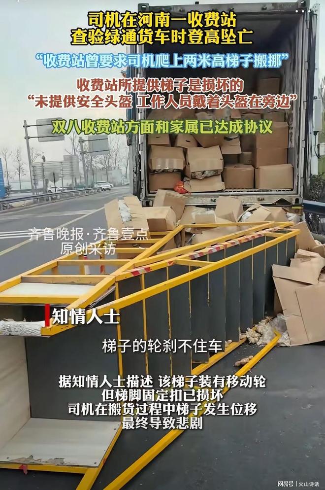 悲剧!近日,河南一名卡车司机载着一辆满载生姜的卡车经过收费站时,工作人员检查其是否符合绿色通行证,并要求司机爬上集装箱顶部打开。没想到,司机刚爬起来就发生事故,最终摔倒在地身亡!据媒体2025年12月9日报道,事件发生在12月6日,一名来自山东聊城阳谷的大货车司机拉着一车生姜前往农产品市场。卡车经过河南双坝收费站时,卡车司机被工作人员要求爬上一辆2米高的卡车进行检查,不慎坠落身亡。据知情人士透露,当他们经过收费站时,工作人员要求司机爬上2米高的梯子打开箱子并检查货物,但没有给司机戴安全帽。工作人员戴着头盔站在一旁看了。他们提供的梯子装有移动轮,但梯子固定扣坏了。司机站在梯子上搬运货物时,发生位移,导致其失去平衡摔倒,货物也随之掉落。收费站工作人员站在一旁,既没有提供安全头盔,也没有帮忙上楼梯。事发后,他们甚至删除了监控录像。收费站回应称,司机在搬运货物时不慎掉落,他们与家属达成协议,赔偿他们5.5万元。针对这一事件,有网友愤怒批评,这是司机载货的“绿色通道”吗?这就是通往地狱的“绿色之路”! 55000的丧葬费没用?家里的顶梁柱垮掉了!在末尾添加两个零是不够的! ! !就是“以工作之名”,为难司机,危害人民生活!双坝统计局玩忽职守罪致人死亡的犯罪嫌疑人正在严肃查处,将按照刑法最高刑罚予以严惩! !有网友认为,执法人员执法可以,但不能违反规定执法。这里有很多问题。首先,设备有问题。其次,司机向执法人员解释了车内物品。第三,执法人员必须主动上车,因为他们不信任司机。此类事件的责任完全在于检查人员。赔偿首先按照直接工伤处理,然后再走法律程序。综合分析,这起事故的发生令人悲痛。梯子损坏、安全帽缺失、无自动扶梯的高空作业。河南绿通发现,这起悲剧并非事故,而是完全违反安全责任的行为。预合规检查的错误是为了保护底线,而让司机用风险换取通过的过程本质上是对规则的漠视和对生命的侮辱。此次事故至少反映出该站收费管理存在两大问题:一是司机爬上去时,工作人员没有扶梯,也没有提供头盔,表现出对他人生命的漠视。二是收费站楼梯设备坏了,没有及时更换。如果这些事情做得好的话,这次事故就不会发生。你的生命只有一次,没有运气的余地!希望通过这次事故,促使有关部门彻底排查各收费站的安全风险,完善绿色通行检查的安全规定,让每一位卡车司机都能在安全的环境下通行。不要让“联合检查”成为“危险工作”,不要让类似的悲剧再次发生。你做什么想一想吗?