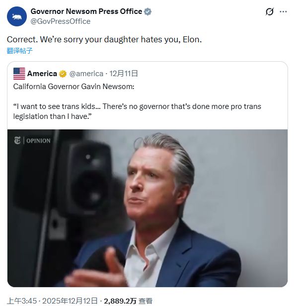 加州州长:“你女儿恨你,埃隆”,马斯克回应