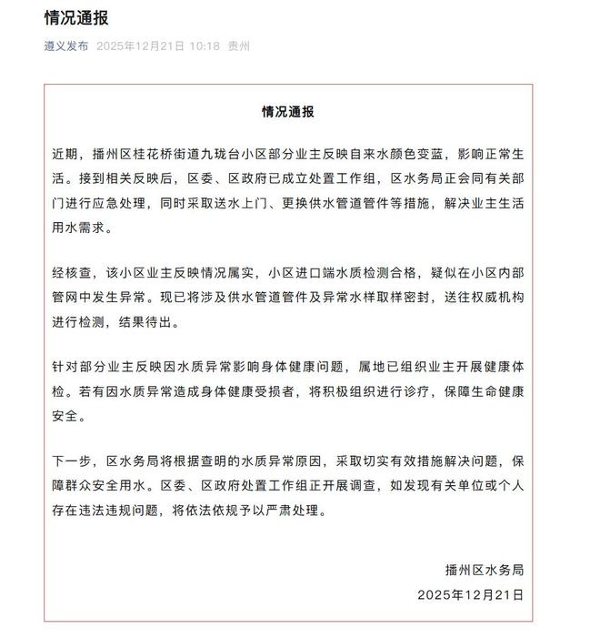 封面新闻记者 马家豪 12月21日,贵州省遵义市亳州区水利局针对近期备受关注的九龙台社区自来水变蓝事件发布情况通报。报告称,已成立处置工作组,采取紧急措施,水样已送权威机构分析。亳州区水务局22日上午通报了这一情况。封面新闻记者采访了多位社区业主、当地水务部门和供水公司了解到,这起“最近”的公共事件持续了八个月。自来水公司更换水管后,部分业主家中的自来水仍呈蓝色,部分业主体检后出现水管肿块等情况。业主反映,从小区水管流出的水是蓝色液体。自来水已被几个月了,但自来水公司测试了它并说它“通过”? “从4月18日开始,每当出现蓝色的水时,我家就有了。”业主陈先生告诉记者,九龙台小区是一个将于2024年交付的新小区,目前居住着约300名居民。 4月18日,小区业主向物业公司报告水情异常。早在今年4月,就有业主发现家中自来水呈异常蓝色,并向物业管理公司和供水单位遵义亳州区隆庆供水有限公司举报。“间歇性出现蓝色的水,如果几个小时不打开自来水,然后再打开,就会出现这种情况。水烧开几分钟后,颜色就正常了。”陈先生表示,“蓝水”没有明显的气味,但放置一段时间后会有明显的蓝色沉淀物。根据 m 的声明任何业主,几个月以来,自来水公司总是给出“厕所清洁灵有问题”的解释,并不断询问业主“哪家公司使用卫生间清洁灵”。业主熊先生回忆说:“他们就用这个借口来逃避问题,直到7月份,蓝色的水不断出现。”熊先生说,这期间,自来水公司多次取样,但出炉的检测报告均显示“合格”、“澄清”的水质结果。这个结果与主人亲眼看到的蓝色水严重不符。陈先生愤怒地指出:“他们采样的蓝色液体被收集了,透明液体被送去检验。我们追问后,他们找到了一个遥远的理由,说检测公司想在检验前过滤掉它,这不是坑蒙拐骗吗?”供水公司清除的附着在管道上的油漆状物质的变化11月底突然更换水管。一位业主在社交平台上发布了“蓝水”的视频并引起公众关注后,事情开始迅速进展。 12月5日,小区业主在更换水管时发现水管内有蓝色的痕迹。 12月5日晚,有业主发现社区工作人员夜间拆除供水管道。业主心存疑虑,上前检查并触摸脱落的管道,发现内墙上附着大量滑溜溜的、类似油漆的物质。 “我们当时就意识到了问题的严重性。”先生说。陈。随后,自来水公司迅速行动,几天之内将小区公共区域的供水管道全部更换为304不锈钢管。随后,在业主强烈要求下,自来水公司组织社区居民前往尊二附院12月中旬到医科大学体检。据业主统计,首批参加体检的人员有200余人。在相关部门安排的体检中,部分业主出现肺部结节。 12月16日,第一批体检报告出炉。 “已有20多名业主出现了肺部结节、钙化等问题,其中很多人都有同样的症状。”近日有业主在体检时发现肝脏有肿块。熊先生说,他给邻居的妻子检查身体后,还发现其肝脏内有一个约两到三厘米的肿块。水务局回应:要等调查结果才能确定身体异常是否与水有关。 12月22日,封面新闻记者分别致电亳州区水务局和隆庆供水公司。,有限公司分别。水务局工作人员表示,水体异常原因仍在调查中。对于检测进展,该工作人员表示,样本已送往外省第三方机构,但具体发送单位以及检测结果公布时间“尚不清楚”。随后,记者联系了该社区的自来水供应商——隆庆市供水有限公司自来水公司。工作人员表示,“目前涉及的住户约有80户,目前相关部门正在调查,大家还要等待调查结果。”对于此前小区水质监测结果一切正常,自来水公司工作人员表示,“我们之前的检测,从我们水厂管网到进入小区前,都是合格的。”当记者询问九龙台社区水管中的蓝色液体是否是真的时通常情况下,工作人员说:“我需要了解更多。”该工作人员还向记者证实,12月5日,他们公司确实已安排工作人员更换九龙台社区的水管。陈先生表示,更换水管后,家里的自来水中仍然出现蓝色液体。不过,据一些小区业主反映,虽然自来水管已经更换,但住户管道内残留的污染可能仍是清澈的蓝色,而且时不时还会出现蓝色液体,“这些情况还在进一步调查中,最终以正式调查结果为准。”他们表示,目前的要求是公布完整、真实的检测报告,查明污染源和具体物质,并付费,对每户家庭的管道和涉水设备进行彻底清洗或更换。